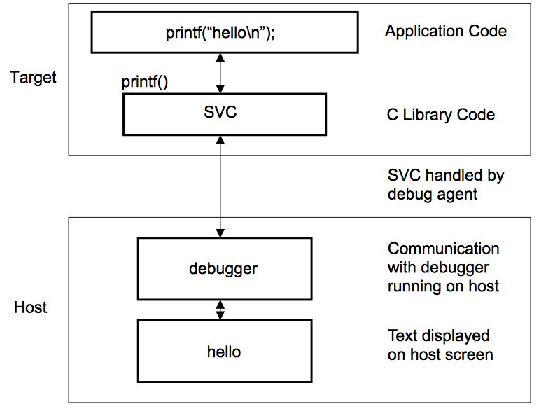 In other words, an ARM based MCU can run C library functions, such as printf(), scanf, or even fopen, and have these interact directly with the host computer attached to the device. By doing so, it can benefit from the screen, the keyboard, or the disk of the host.