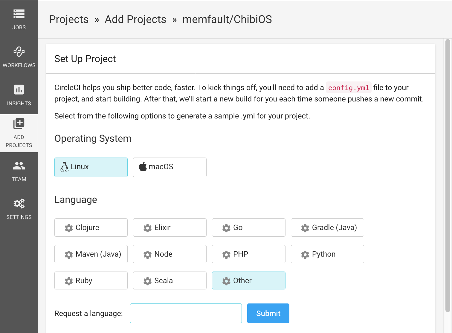 We’re now ready to set up CircleCI. Head to https://circleci.com, create an account, select “Add Projects” in the sidebar, and search for your ChibiOS repository.