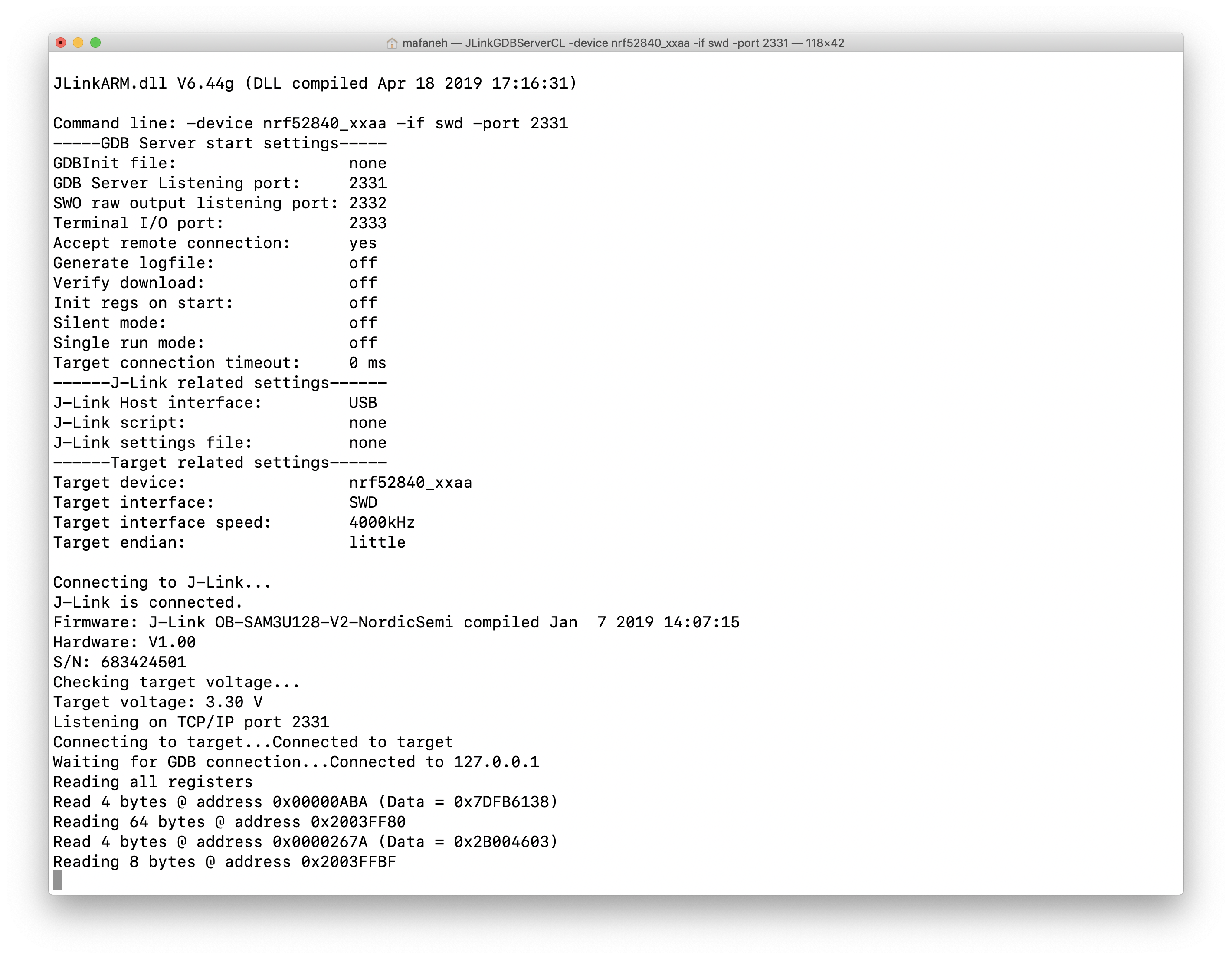 $ JLinkGDBServerCL -device nrf52840_xxaa -if swd -port 2331- “-device” specifies the device type (“nrf52840_xxaa” in our case).