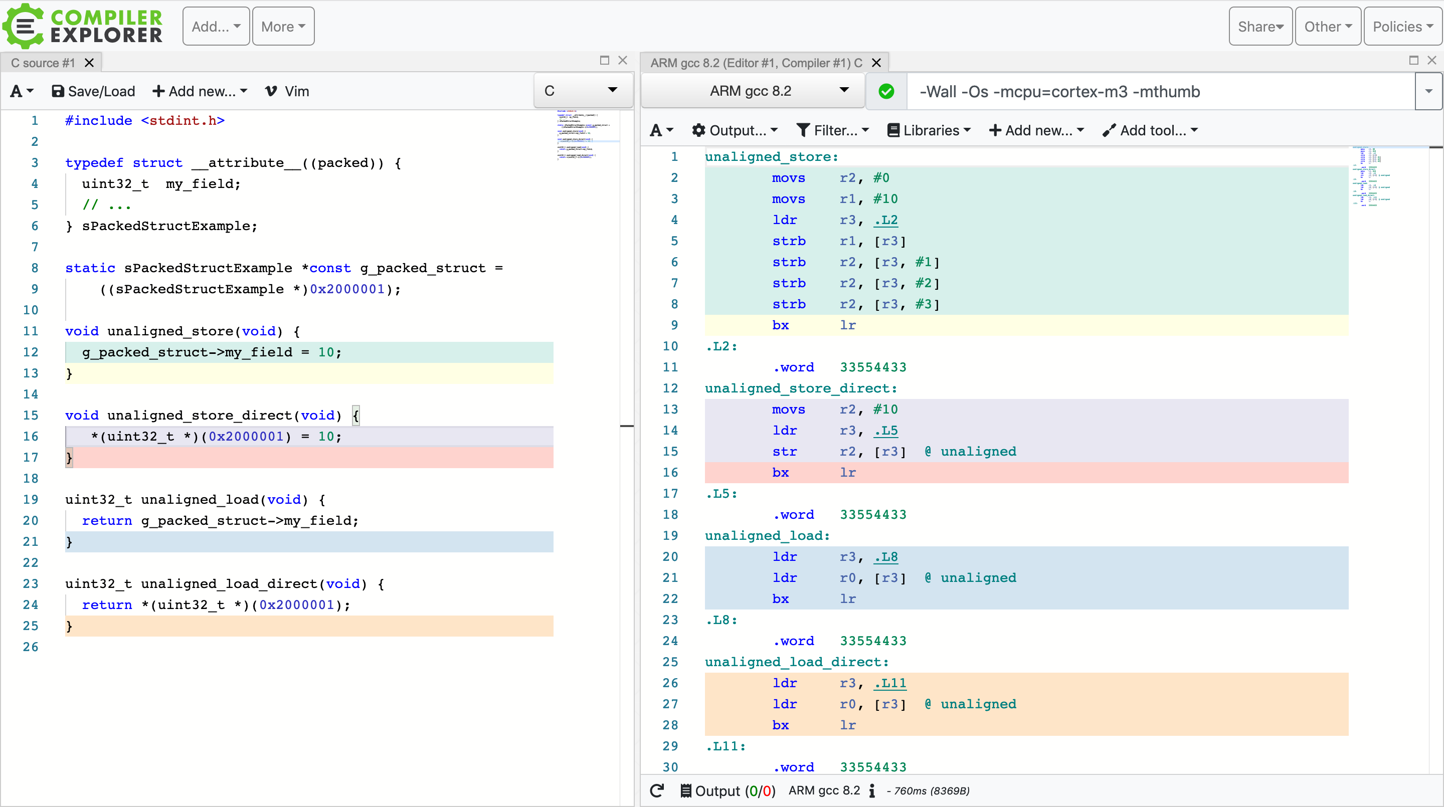 For ARMv7-M, 4 byte loads and store instructions (ldr and str, respectively) support unaligned access. When compiling code for space optimizations (using -Os CFLAG), I would have expected unaligned accesses to get optimized using this instruction. What I noticed is for some reason if the unaligned store is through a packed structure, the optimization does not take place.