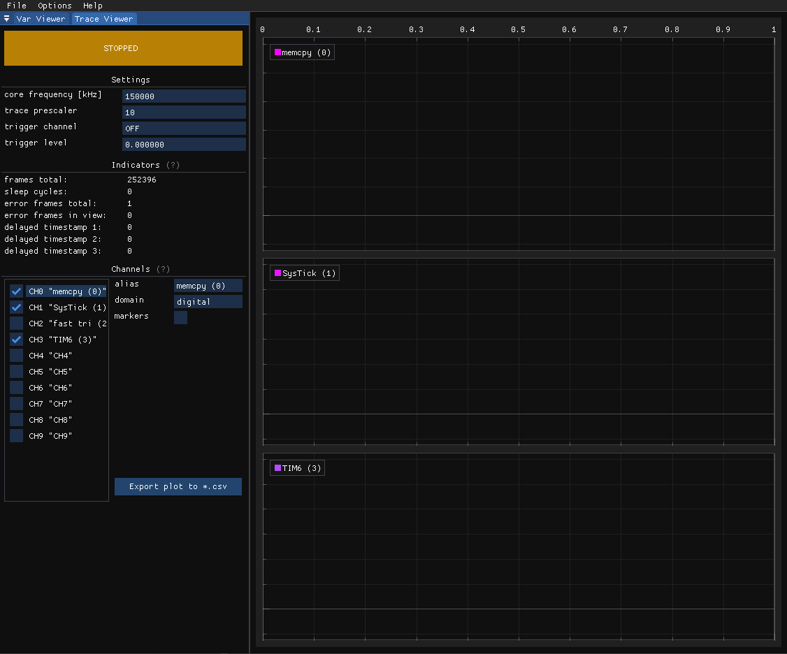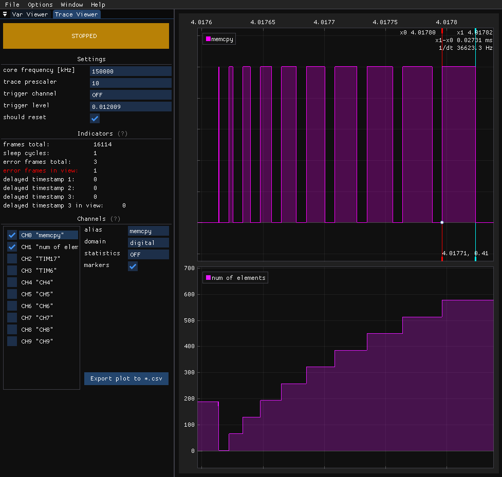 Trace Viewer is a module that reads and parses SWO (Serial Wire Viewer) data using an ST-Link. You need to connect SWDIO, SWCLK, SWO, and GND to use it. This tool operates synchronously, meaning it visualizes data points at the rate they are produced on the target. A data point can be either a special single-byte flag used to create digital plots or any value that fits within up to 4 bytes, as in the case of ‘analog’ plots. It incurs minimal performance overhead, involving just a single register write per plot point, as the ITM peripheral handles serialization and timestamping. Trace Viewer can be employed for profiling specific parts of the codebase or visualizing signals that are too fast for the asynchronous Variable Viewer. Its main limitations are the maximum allowed SWO pin baud rate of the ST-Link and that the ITM peripheral is supported only on Cortex M3/M4/M7/M33 cores.