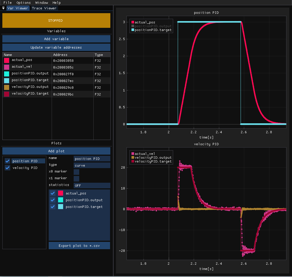 Variable Viewer is a module that reads variables’ values directly from RAM using ST-Link SWD (only SWDIO, SWCLK, and GND connection is needed). It is asynchronous, which means it samples the memory with the period set on the PC. It is entirely non-intrusive and can log many variables at once. Writing is supported as well. There are some trade-offs, though. The first one is that logged variables’ addresses must be constant, meaning they must be globals. Moreover, with more aggressive optimization, some variables may get optimized and fail to be logged.